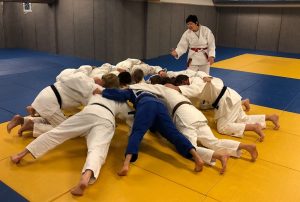 Fra lørdags morgen av var også konkurranseutøverne med. Dagen startet med judodrakten, og hva man må være nøye på. Man har ikke lov til å rette alt for mye på drakten underveis i en kata. Så var vi klare for å komme i gang med Nage-no-kata. I oppvarmingen ble det bakt inn bevegelser og fallteknikker som er nyttige.